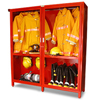 Gabinete para equipo de bombero fabricado en lámina negra, esmaltado en color rojo bermellón, con un entrepaño y dos puertas para vidrio. Para guardar equipos de bombero completo a partir de 2 y hasta para 6.
