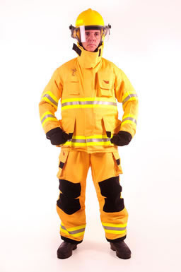 Fabricado material NOMEX III aramida de 7.5 02/yd2, es un material resistente a la flama, abrasión, rasgado y es impermeable. Su barrera contra vapores y gases calientes es de neopreno y está localizada entre la capa exterior de NOMEX y la protección térmica que lo protege del calor radiante y por conducción, ambas capas abarcan todo el interior del chaquetón y del pantalón, además son fácilmente desmontables para facilitar su mantenimiento. Para mayor visibilidad cuenta con cinta reflejante de tres pulgadas de ancho en muñecas, solapa y borde inferior en el chaquetón, y en la parte inferior de las piernas en el pantalón.
